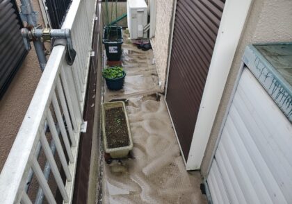 バルコニーにはプランターや物入などが置いてあり、防水層が直接見えない部分もあります。
