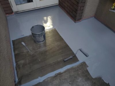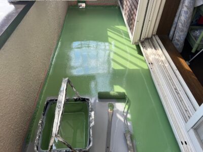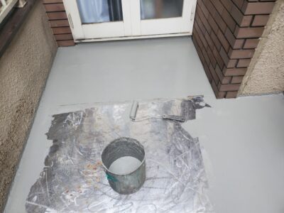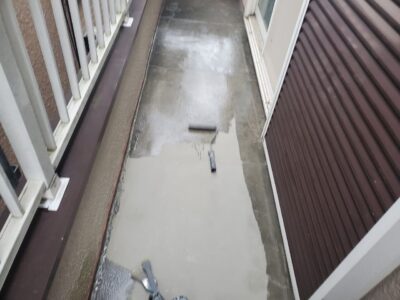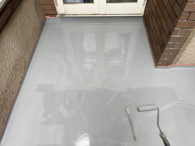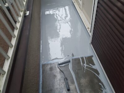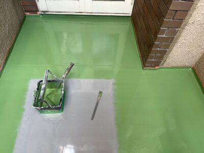 不陸凹凸なく均一にローラー塗りとします。 材料は平場用のレベリングタイプを使用しますが平滑に均すことが大切になります。