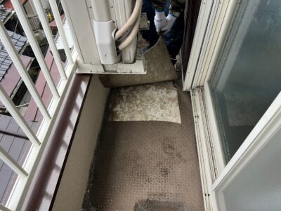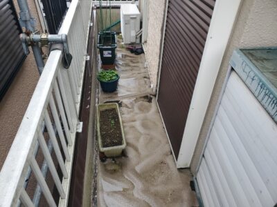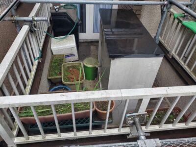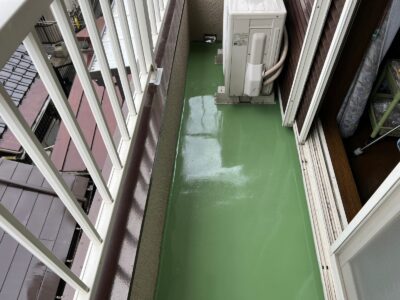 バルコニーにはプランターや物入などが置いてあり、防水層が直接見えない部分もあります。