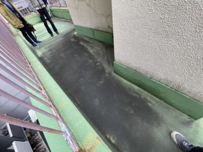 下階のバルコニーも同様に黒ずんで劣化しています。
