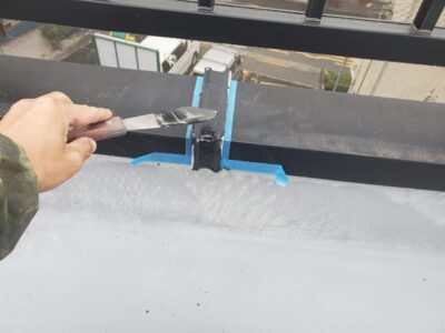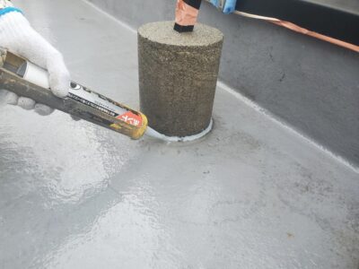 動きが発生する手摺基礎と防水層の入隅部にシーリングを打ちます。