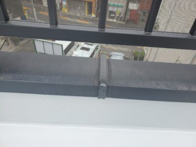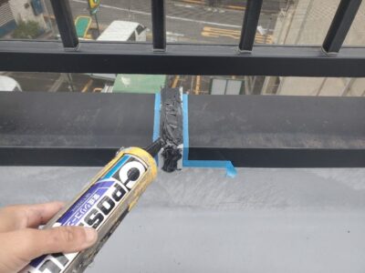 手すりのアルミ笠木ジョイント部は両サイドの部材の上に被せるようにオーバーブリッジシーリングを行います。
