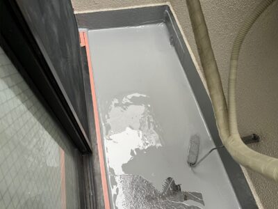 バルコニーも同様に、立上りの一層目のウレタン防水主材を塗ります。 規定塗布量は平場と同様に2回塗りで2mmの厚みとなります。