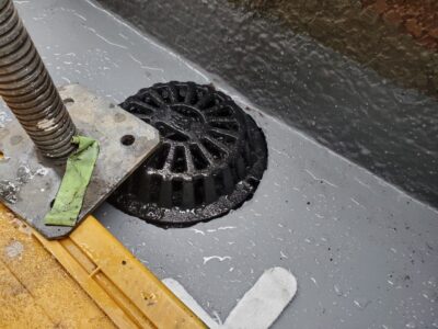 平場のウレタン材はセルフレベリングタイプを使用し凹凸なく平滑に塗ります。仕様は、ウレタン防水/立上り/フッ素TP 密着/クロス無し/2㎜