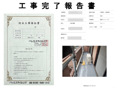 お引渡しの後に工事完了報告書と工事保証書を提出させて頂きます。