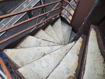 ウレタン塗膜防水 階段通路密着防水工法 フッ素トップコート・2F/3Fバルコニー防水工事 鉄骨階段防水工事 豊島区駒込E様