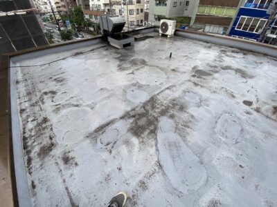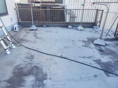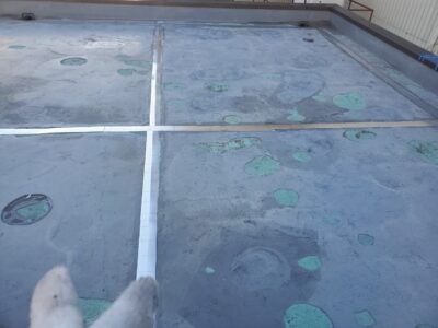 ウレタン防水層が施工されていて、部分的に補修をしている箇所が見られます。