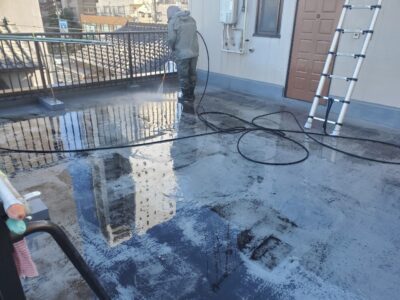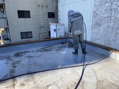 ※高圧洗浄は、防水面に付着している汚れを10~15Mps程度の水圧で洗う作業です。