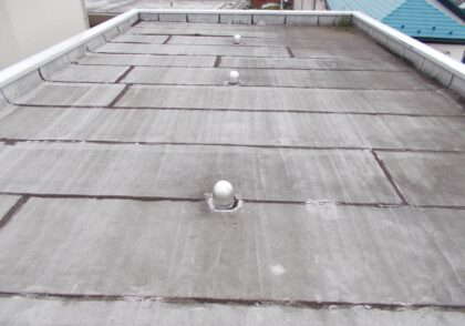 既存防水工法がアスファルト防水(露出断熱工法)で20年経過しており、15年以内であれば、アスファルト防水トーチ工法で「かぶせ工法」とすることも可能であったが、膨れや剥離などの状態から今後の下地との密着状態を考えて、既存防水層を撤去して、新規にウレタン防水防水通気緩衝工法としました。