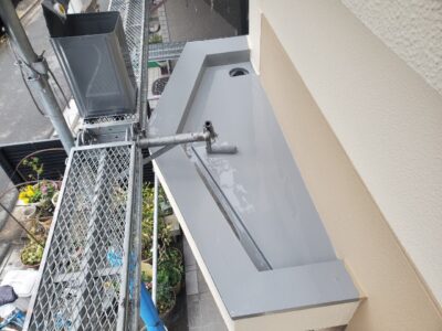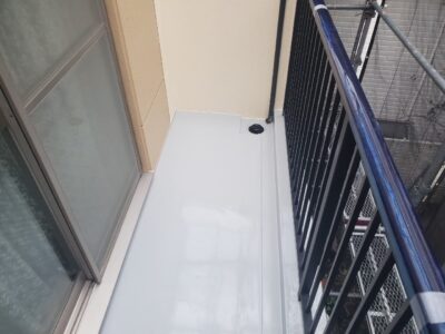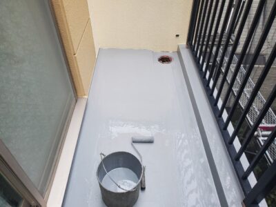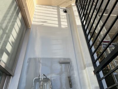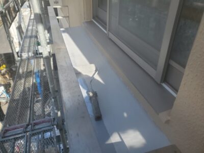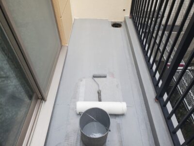バルコニーもウレタン防水主材を規定塗布量を塗ったあとにトップコート塗りが完了しました。