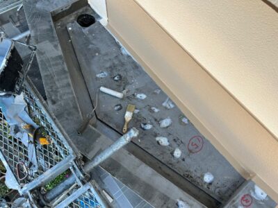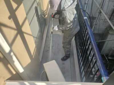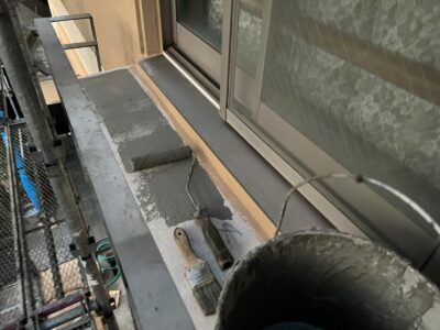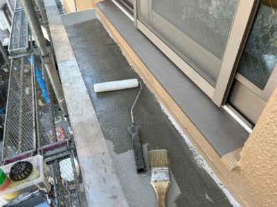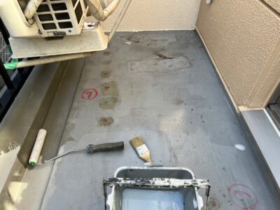 バルコニー床には防水用プライマーを塗ります。プライマーは密着性を高める接着剤のような役割があります。