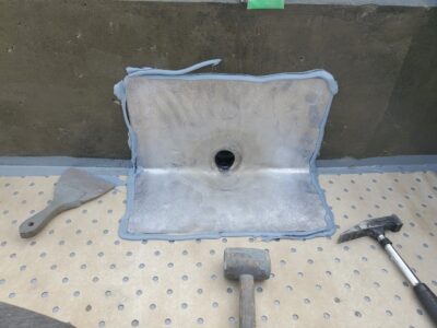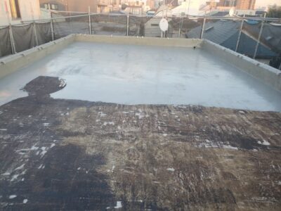 露出防水層が20年程度経過していて重ね塗りをするにはリスクが高いので撤去工法としました。