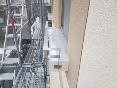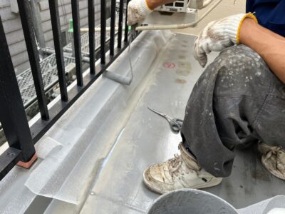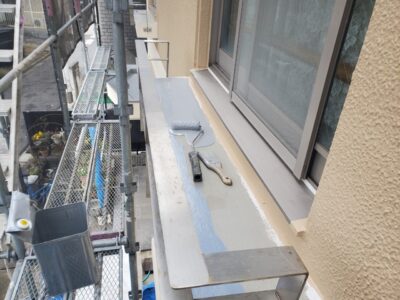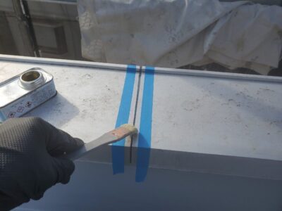 アルミ笠木のオーバーブリッジシール作業です。プライマー塗りをしています。