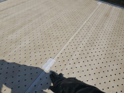 プライマー塗りの上に孔あき通気気シートを貼りしっかりと転圧固定し接着させます。通気シートは下地との緩衝効果もあります。