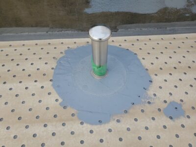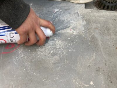 洗浄後に既存の密着ウレタン防水層に注入用の孔を空けます。