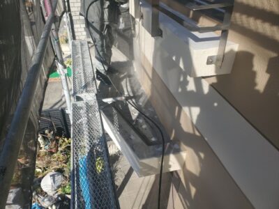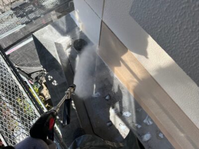 ひさし部分はアスファルト防水ではなくウレタン防水をするために高圧洗浄をします。