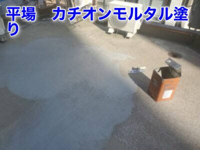 平場の下地コンクリート面にカチオンモルタルを塗って下地を整えます。