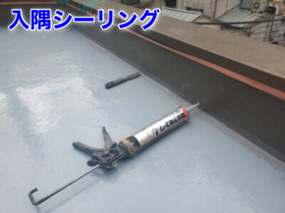 入隅シールを打つ目的は平場下地と立上り下地を緩衝する役割もあります。また、ウレタン防水層の厚みも均一に保つ施工がしやすくなります。