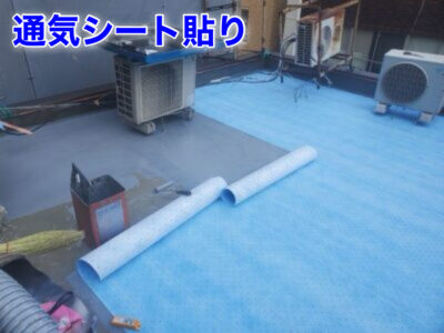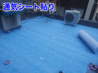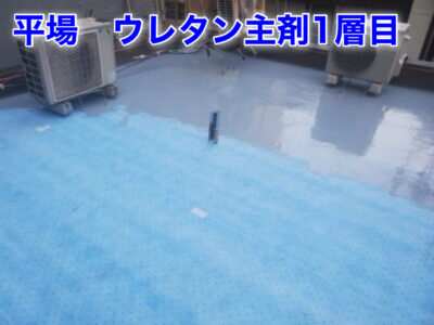 ブルーの通気シート上には専用の目止めウレタン材を塗ってから1層目のウレタン防水主材を塗ります。