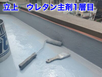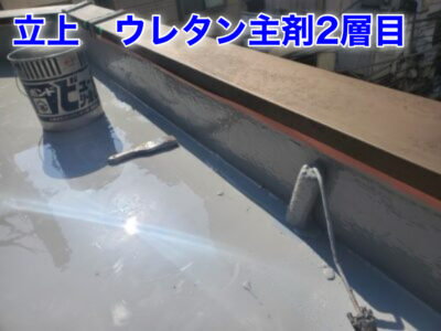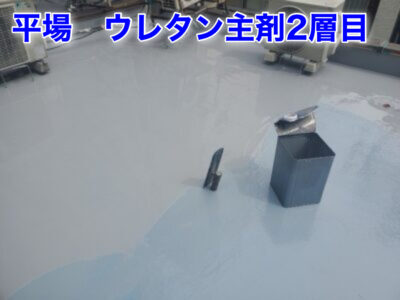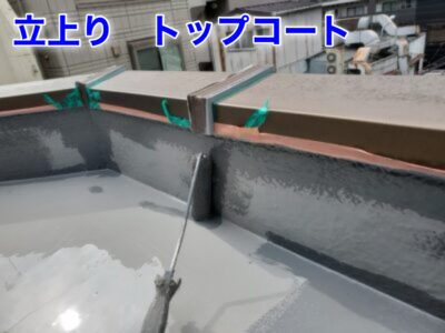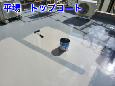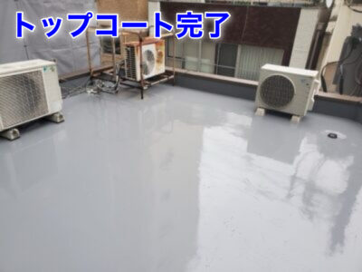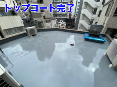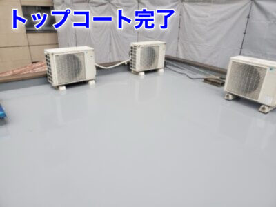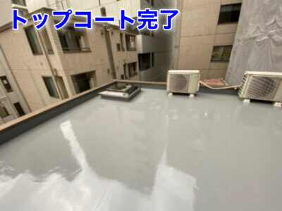 ウレタン防水主材を規定塗布量を塗ったあとにフッ素トップコート塗りが完了しました。