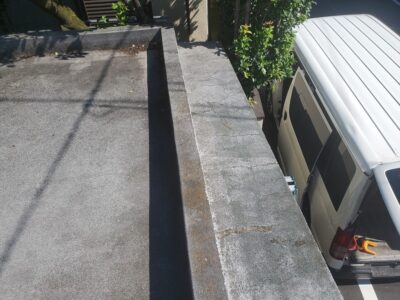 【工事内容】 鉄筋コンクリート造のガレージ天井から雨漏りがあり、陸屋根の防水改修を行います。 立上り部には見えない打ち継ぎがありクラックが発生し雨水が侵入した跡もあり外壁面のクラックのシーリング補修も行います。 【工事詳細】 高圧洗浄 下地調整 カチオン型モルタル塗り ウレタン防水/平場/フッ素TP 密着/クロス無し/2㎜㎡ ウレタン防水/立上り/フッ素TP 密着/補強クロス/2㎜ ウレタン防水/ひさし/フッ素TP 密着/クロス無し/2㎜ 外壁クラック/シール処理 |