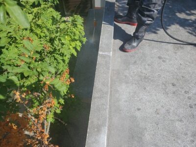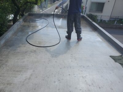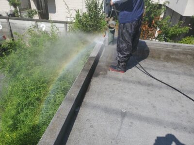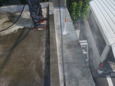 防水面をバイオ高圧洗浄で現状の汚れを洗い落とし、清潔な状態にしてから防水を行うことで密着性を高めるために不可欠な作業です。