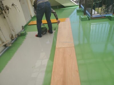 防水をする場所が共用廊下などで日中は防水作用をしても朝夕は居住者さんが帰宅し通路として歩行をするので仮設通路を養生合板を加工し敷きます。