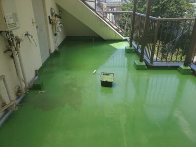 既存のウレタン防水層が剥がれています。剥がれている内部を見るとコンクリートの下地ではなく緑色の塗膜が確認できます。