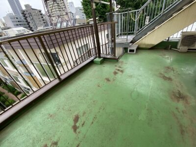 鉄骨建物 ルーフバルコニー防水工事 天井補修 ウレタン塗膜防水 密着防水工法 フッ素トップコート 天井雨漏れ 内装リフォーム豊島区目白Hビル