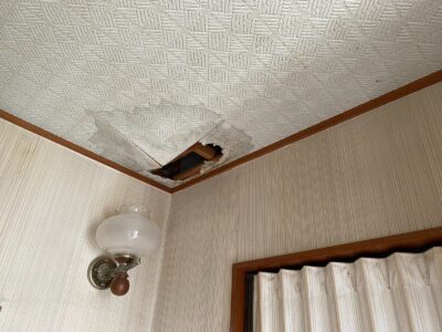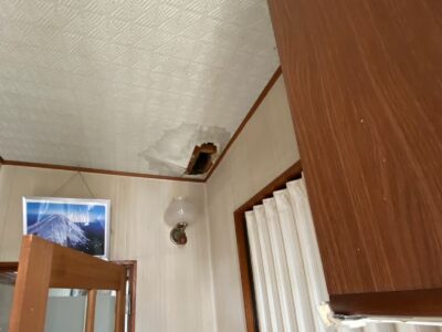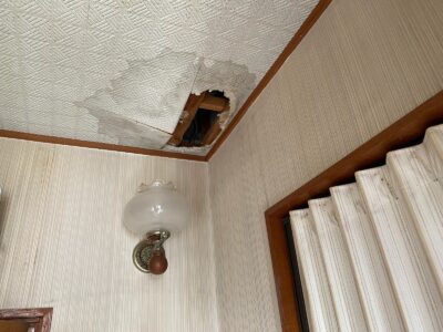 漏水による蓄積された天井裏の雨水が天井の下地を腐食させ、その結果天井に穴が空いてしまいました。