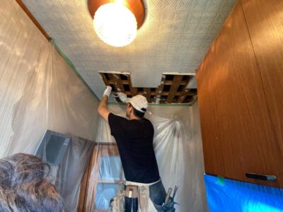 防水工事が完了し雨漏り完全に直りました。漏れてていた天井部分を剥がしして新たに仕上げボード貼りを行います。