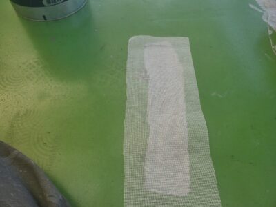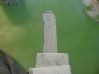 脆弱補修をした部分は既存防水層との接合部となり後に密着部が破断しないようにクロス補強を行います。