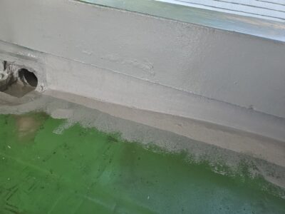ドレン周りと笠木側の架台周りも不陸凹凸調整を行いウレタン防水層を塗ることで周囲にしっかりとした勾配が保たれ水の流れが良く定期的な清掃をして頂くことで泥だまりが発生を防ぎ防水層の適正な維持が可能となります。