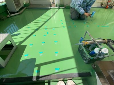 仮通路部分の穴を見落とさないようにテープでマーキングをして一つひとつウレタン補修を行います。