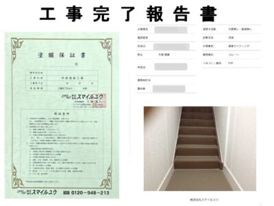 お引渡しの後に工事完了報告書と工事保証書を提出させて頂きます。