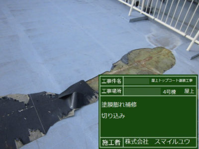 塗膜の脹れに切り込みを入れてます。