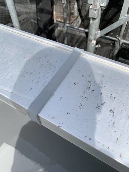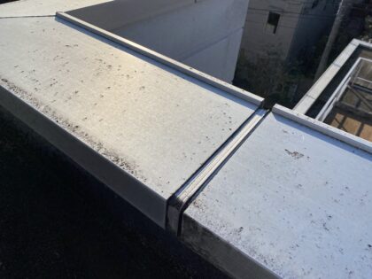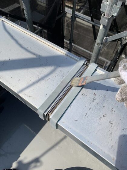 手すりのアルミ笠木ジョイント部は両サイドの部材の上に被せるようにオーバーブリッジシーリングを行います。