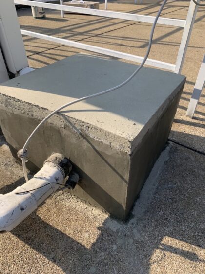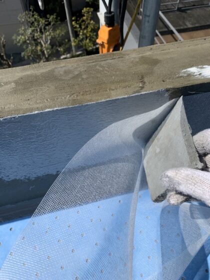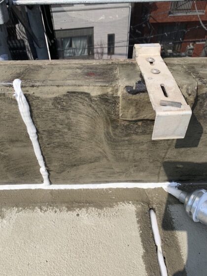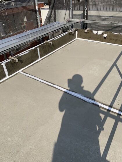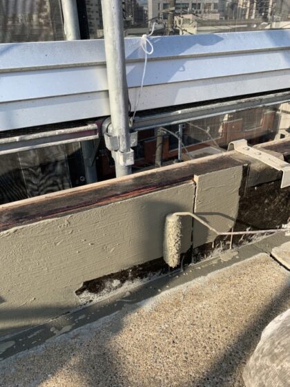 防水層を撤去した部分の下地コンクリートをカチオンモルタルで整えます。