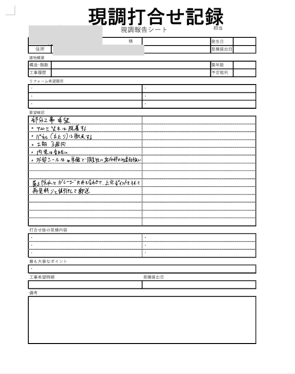 現地調査では建物の気になっている状態や外壁塗装をする目的などを詳しく伺って「現調打合せ記録」に記録をします。