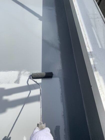 ウレタン主材の2層目を塗ります。防水塗膜は2回重ねで塗ります。立上りを塗ったら、屋上全体に2層目のウレタン防水主材を塗ります。