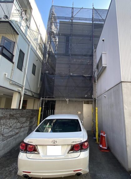 資材の搬入・防水工事のための足場を組みます。