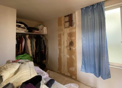 漏水の影響で3階洋間の壁紙クロスやボードの一部が脆くなり、その裏にある鉄骨に漏水の跡が見受けられます。上の階が屋上であるため、屋上防水の劣化が原因である可能性があります。