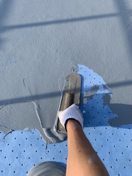 通気シートの上に目止めウレタン主材塗り作業です。