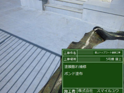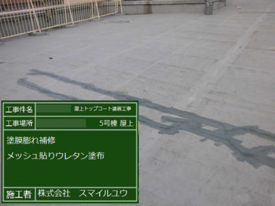 膨れ部補修、メッシュ貼り補強の上ウレタン塗り