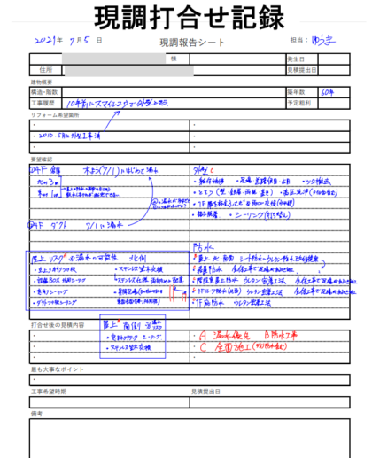 現地調査では建物の気になっている状態や外壁塗装をする目的などを詳しく伺って「現調打合せ記録」に記録をします。
