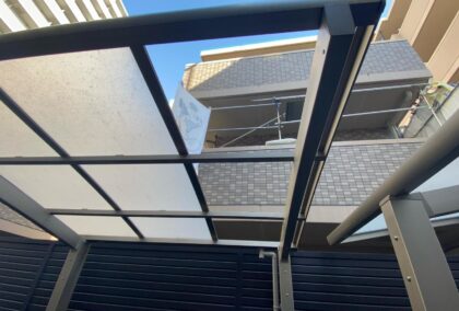 足場の仮設にあたり、駐車場のポリカ屋根が足場の設置位置にかぶってしまうため一部取り外します。取り外した部材は保管して足場解体後に復旧します。