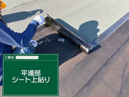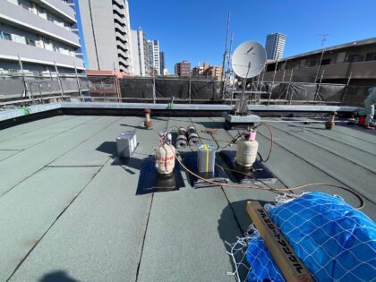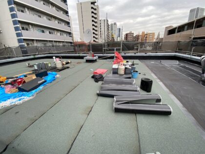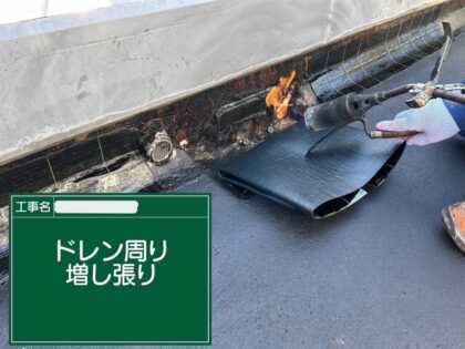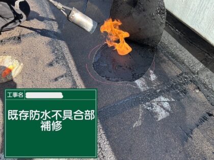 屋上は、新規アスファルトシートをその裏面とアスファルト活性剤が塗ってある下地をガスバーナーで熔かすように炙って張ります。