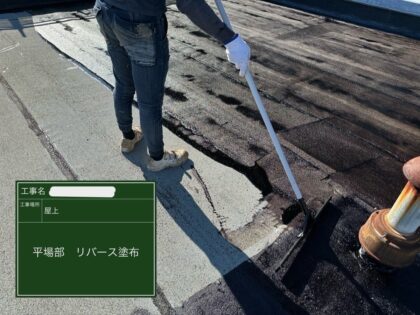 トップコートは防水層を自然環境の風雨や太陽光の熱や紫外線から保護をする効果があります。ムラ無く規定塗布量をしっかりと塗ります。