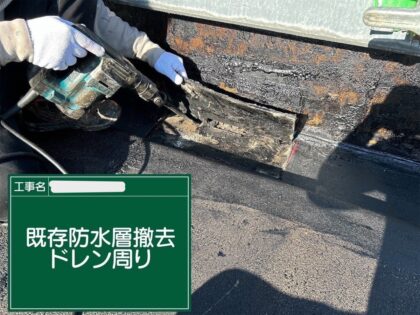 ドレン工事のためにドレン周りの防水層を撤去します。