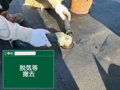 新規アスファルトシートを貼る前に、既存の脆弱部を剥がして補修を行います。